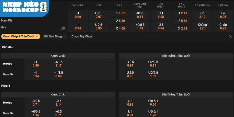 Ở kèo này nếu Mexico thắng có Odds từ 1.50 đến 1.65, trong khi đó Nam Phi dao động từ 5.00 đến 6.00, 2 đội hòa rơi vào mức 3.50 – 4.00. Nhà cái đánh giá khả năng cao đội chủ nhà sẽ giành chiến thắng. Với lợi thế sân bãi cùng kinh nghiệm dày dặn, chọn Mexico thắng là phương án đáng tin cậy.